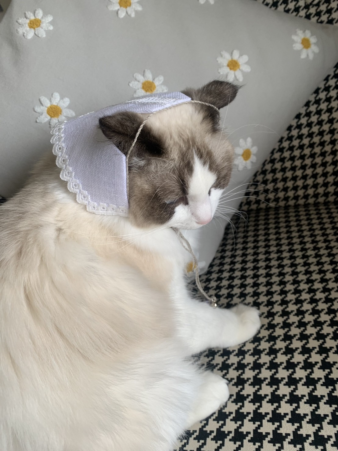 次女が半年ほど前に猫を飼い始めました。娘とSNSを見ていると手作り猫ちゃん帽子のようなものが沢山現れ刺繍でも被り物できるよね・・とオーダーが入りました。猫の耳の形状はこんなんだったんだと耳間や大きさを測りまず残布で大体の形を作成し落とし込んでいきました。ちゃんとイニシャルも入れてね。結ぶテープはピンクとシルバーのいつか使おうと買っておいたテープ。そしてその先に可愛らしい大きなビーズと鈴をつけて。あらあらちょっとかわいいんじゃない。猫は計測、試着も含め終始迷惑そう・・・う~ん猫バカのバカ親でした!がちょっと一休みの楽しいお手々仕事でした。